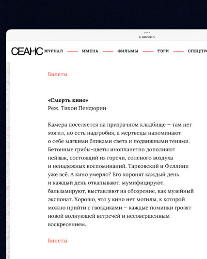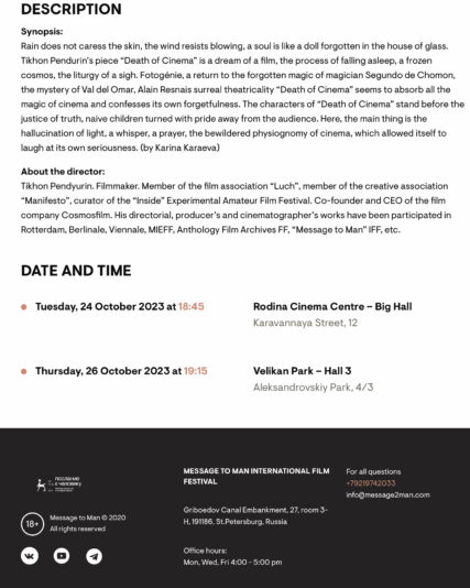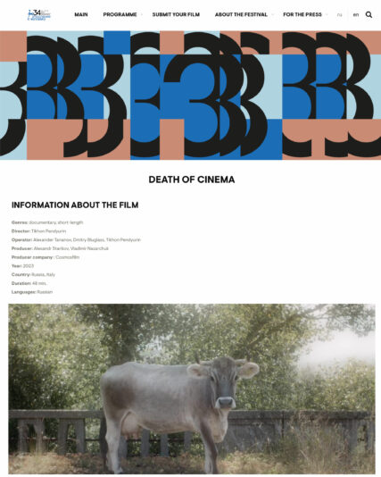 Death of Cinema 25th January 2024 / Films/ Posted by: admin Director: Tikhon Pendyurin Cinematography: Alexander Tananov, Dmitri Bluglass, Tikhon Pendyurin Сosmosfilm © 2023 Share with Categories:Films Share with