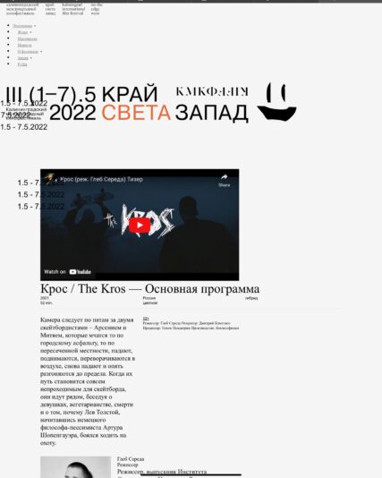 The Kros 19th August 2019 / Films/ Posted by: admin FILM CREW: Producer: Tikhon Pendyurin, Gleb Sereda, Dmitri Bluglass Director: Gleb Sereda DoP: Dmitri Bluglass by Cosmosfilm studio Share with Categories:Films Share with